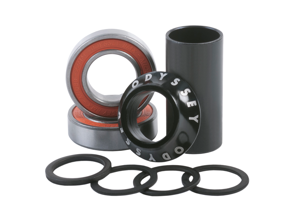 Compatible with 19 or 22mm crank spindles and Mid BB frames. Simple and easy to install. Includes an assortment of spacers to optimize chain line and crank clearance.Odyssey branded 6061-T6 aluminium dust spacer included.